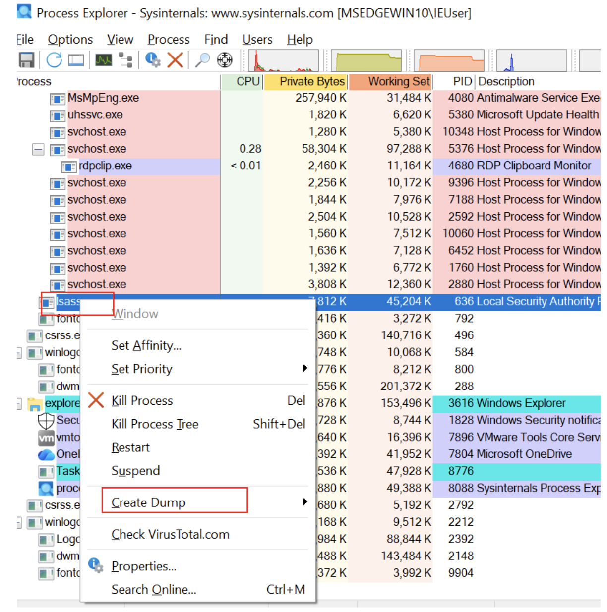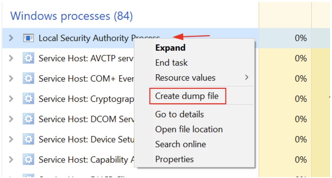 - Right-click lsass.exe and navigate to Create Dump > Create Full Dump .