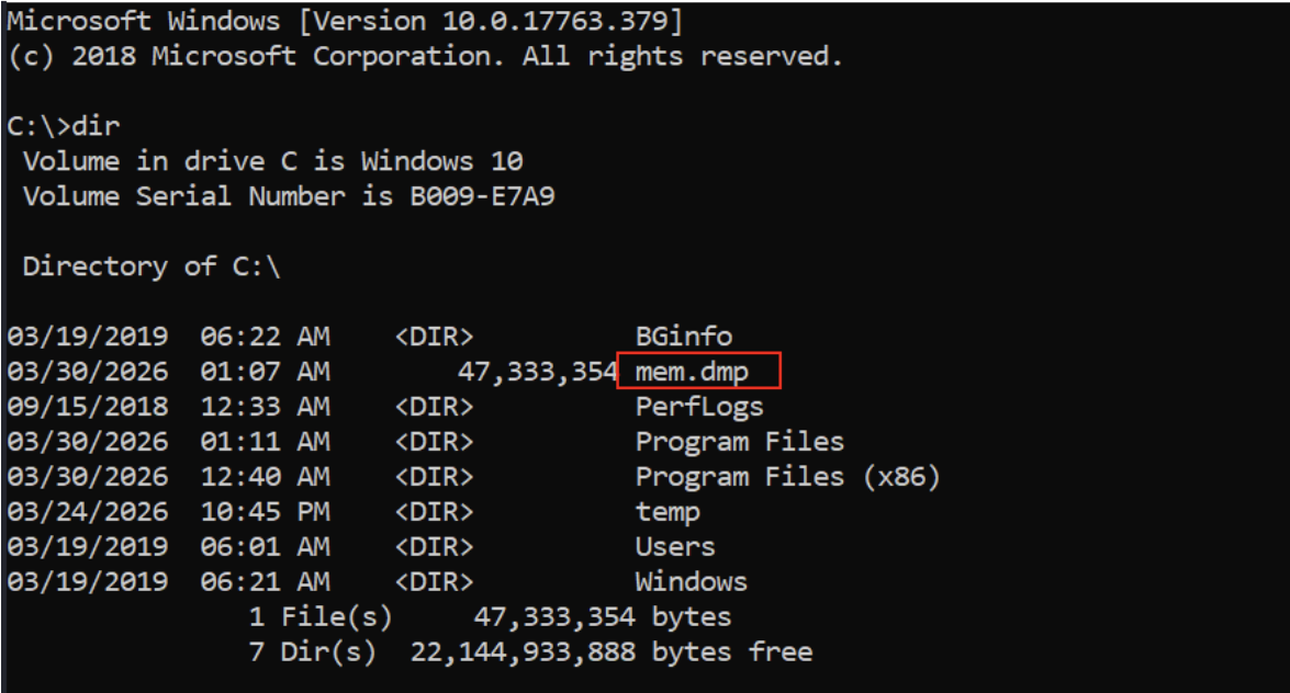 - Output Location — The dump file is created at C:\mem.dmp (or any writable path you specify). The lab shows a 47 MB dump file.