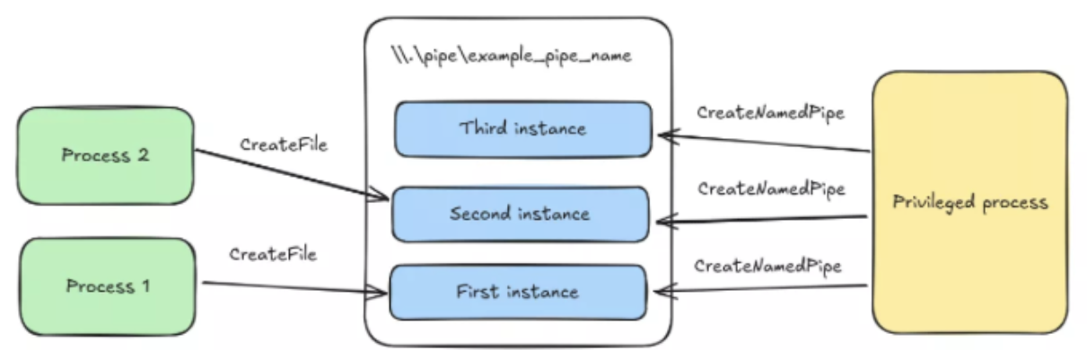 A privileged process listens on a named pipe and creates new instances as new clients connects to it. There is always a new pipe instance, and, as the process expects low privilege processes to connect to it, the ACL on the pipe may be permissive, allowing to read and write arbitrary data.