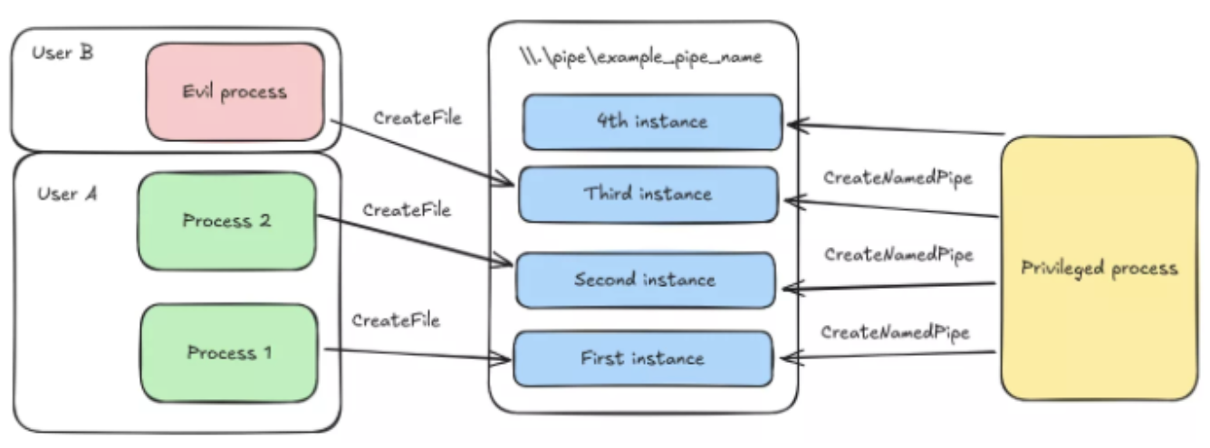 In some cases, we may even have the GENERIC_WRITE permissions that grants us the ability to listen on top of the named pipe. In that case, we can create a new instance of the pipe and wait for another process to connect to the pipe. What we need to do is call CreateNamedPipe first to create a new instance of the pipe, then call CreateFile with the same name so that we end up in setup where legitimate named pipe instances are interleaved with the ones created by the Man-in-the-Middle process.