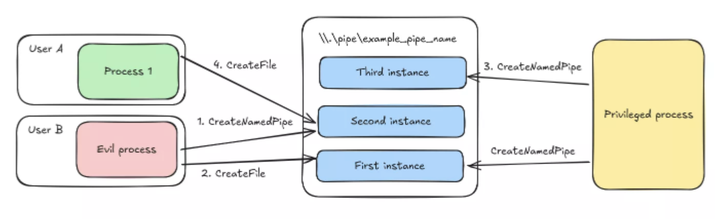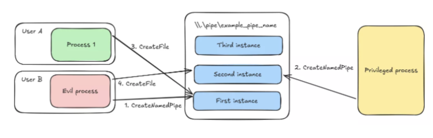 Such techniques highlight the importance of always validating data received through untrusted channels, such as named pipes, especially when data can come from a different security context, such as another user. They also show that ensuring strict ACL on named pipes and checking for the security flag FILE_FLAG_FIRST_PIPE_INSTANCE in CreateNamedPipe can help reduce the attack surface.