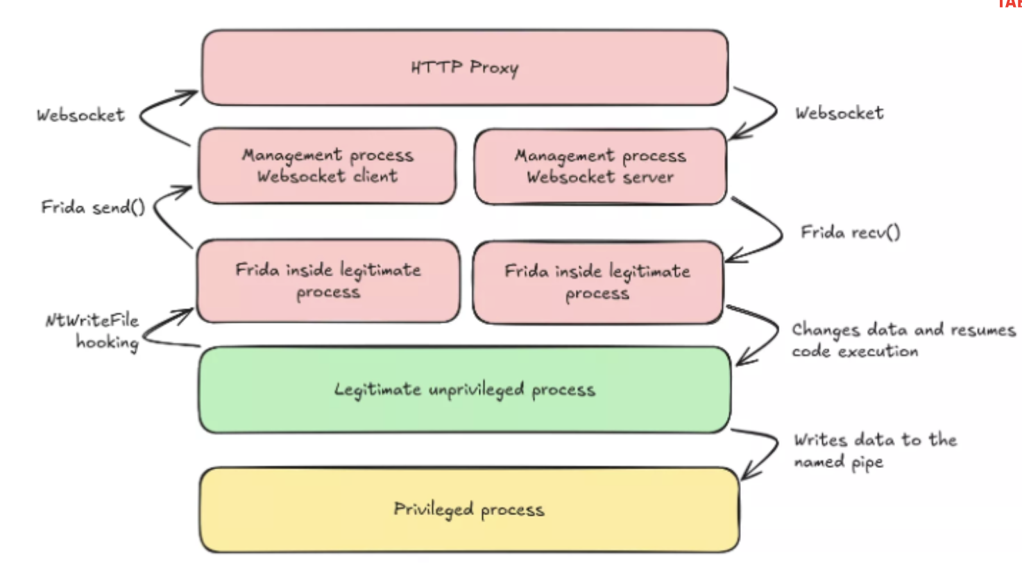 To implement such a technique, we created a frida-based tool which injects into a target process in order to hook syscalls that are used to read and write data to named pipes. To make named pipe data available for modification and interaction with other tools, we choose to send the data to a websocket, mimicking a web-browser talking with a backend server in a bidirectional way. This choice also makes it user-friendly to modify messages without having to rewrite a complete user interface. The tool is available in Synacktiv’s Github.