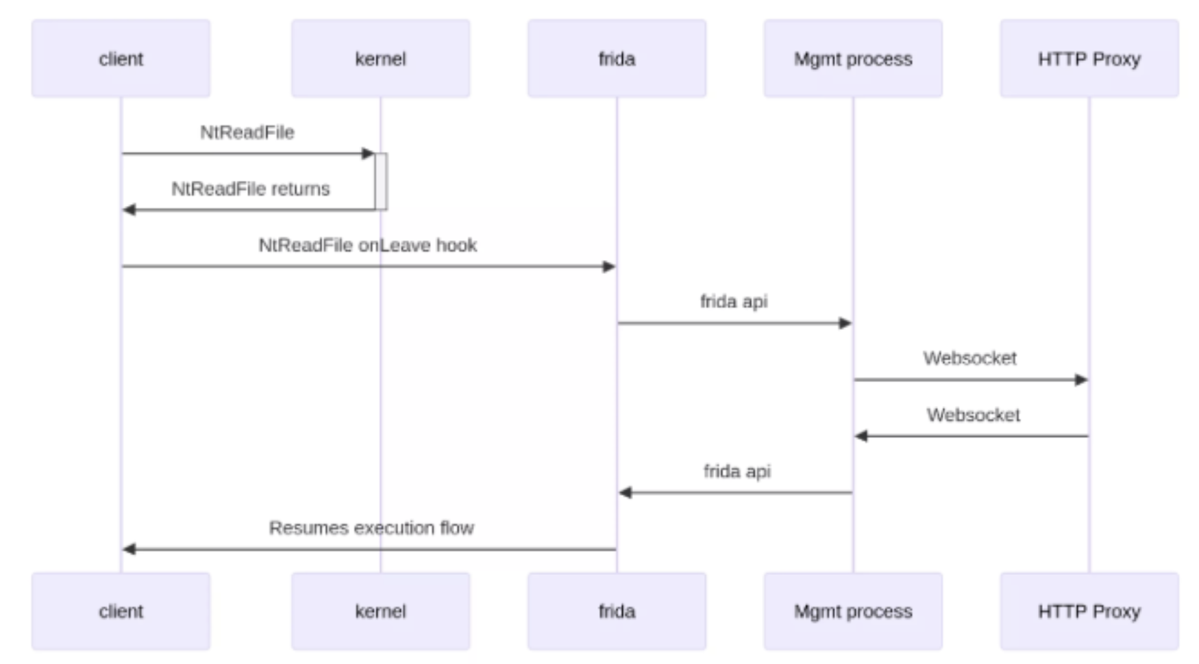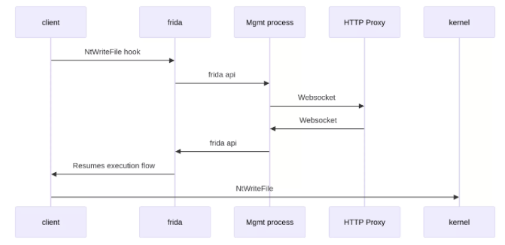 The simplest case is when the client process opens the named pipe for synchronous IO. This is the default behavior when calling CreateFile. In that case, the process calls NtWriteFile and NtReadFile to write data to the pipe, and to read data from it. Since all operations are synchronous, once each of these functions returns, the operation is completely handed over by the kernel. This is particularily interesting for NtReadFile, as we can check the lpBuffer parameter for data that will be processed by the client. The case of NtWriteFile is easier because the buffer of data is to be processed by the kernel and not by the process, meaning we need to interact with it before the call to NtWriteFile. In both cases, we can send data from the injected process to a management process, which will then send it to the HTTP Proxy. The data will then go back to the management process, then to the injected process for modification.