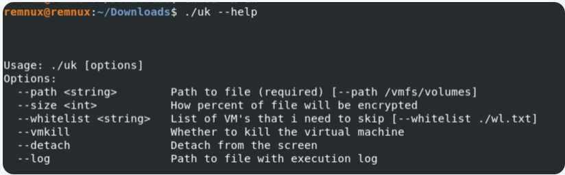 The sample was developed to target ESXi environments. As shown in Figure 2, the help text for the required path argument explicitly references the datastore path /vmfs/volumes, the root directory in VMware ESXi hosts where VMFS (Virtual Machine File System) datastores are mounted. The malware also relies on ESXi-native tooling esxcli and targets VMware-specific paths and artifacts.