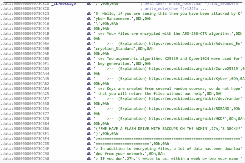 OpenSSL is statically linked but only handles RSA-4096 key wrapping. We did not find any “post-quantum”. The operator likely just copy-pasted the ransom note from a Windows variant that actually supports Kyber1024.