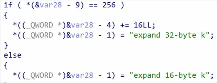 Second, the ECRYPT_keysetup function (Figure 6) uses the “expand 32-byte k” sigma constant. For 256-bit keys, the malware initializes its state by placing this constant in words 0–3 and the key in words 4–11 — mirroring the standard ChaCha layout.