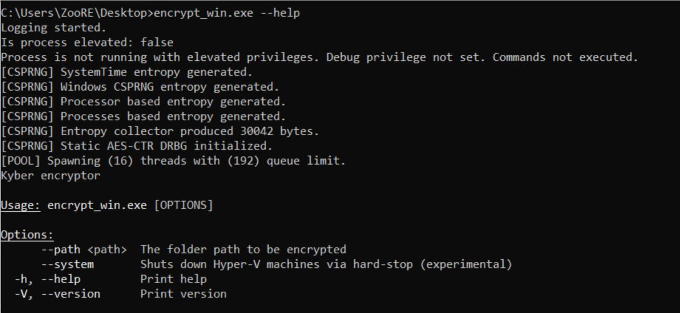Ransomware initializes full runtime initialization, even if invoked with just help flag. It aggregates entropy from four sources: system time, Windows CSPRNG, processor-based entropy via RDRAND, and running process data and producing ~30 KB of randomness to seed an internal AES-CTR DRBG. Unlike typical ransomware, which often relies only on BCryptGenRandom, this strain implements a custom entropy pipeline which suggests the developer cared about key material quality.