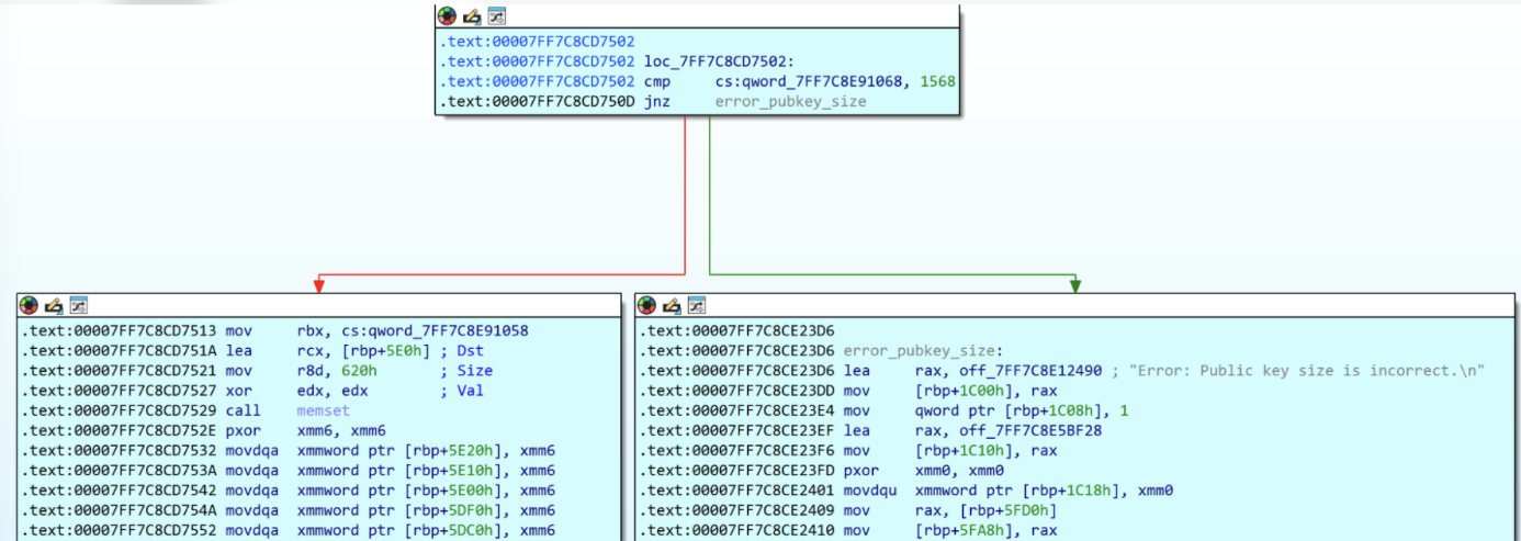 The sample uses a hybrid encryption design. The embedded public key is validated against the expected Kyber1024 public key size of 1568 (0x620) bytes