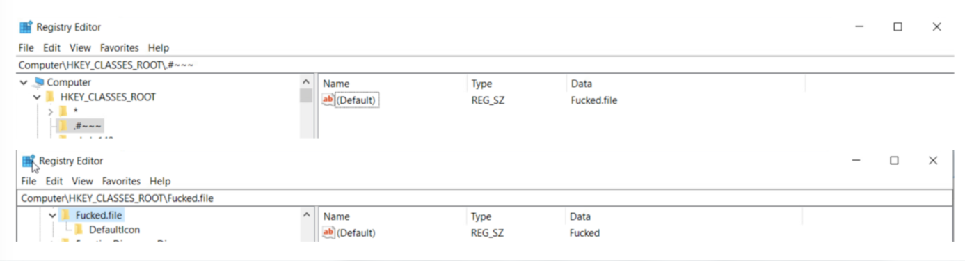When executed with elevated privileges, the malware assigns a custom icon to encrypted files by registering the .#~~~ extension. It creates C:\fucked_icon\ directory, writes processed_file.icon to that location, and configures it in the registry as the default icon.