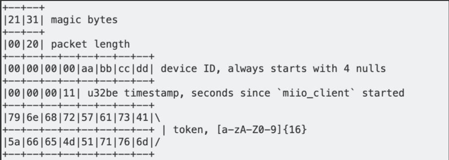 To recap: the packets of Xiaomi’s miIO protocol contain a header, an MD5-based Message Authentication Code (MAC), and an AES-128-CBC encrypted payload. The payload is padded to a multiple of 16 bytes before encryption. The MAC is calculated after encryption.