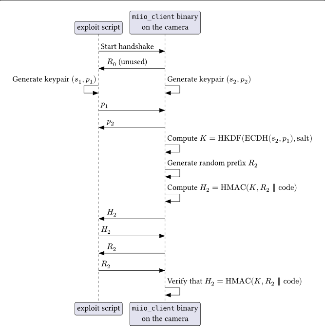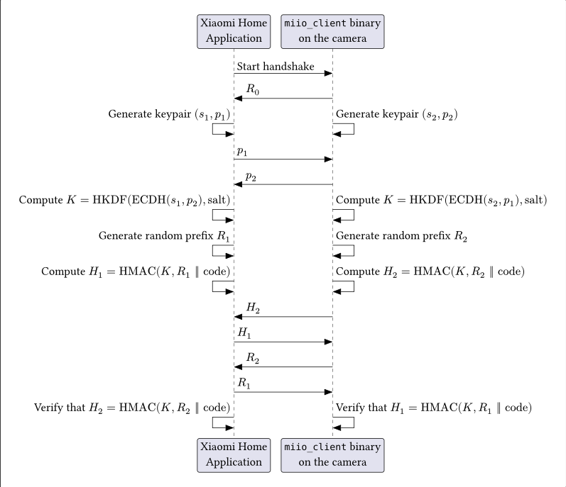 The setup requires the phone to send a specific sequence of “handshake” packets to the camera using the miIO protocol. The camera’s response to the handshake message (R0) contains a hex-encoded token. This token becomes the salt use in the later key generation step (K = HKDF(ECDH(s2, p1), salt)), as it was shown in the previous section describing the packet formats.