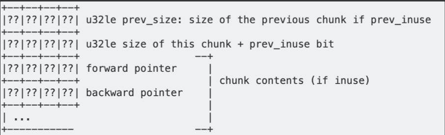 - The next chunk should start at 0x000a347c + 0x6e = 0x000a34ea, with its size field at 0x000a34ee. This value is 0xffffffff, so the size is 0xfffffffe (signed -2). The second next chunk should start at 0x000a34e8, with its size field at 0x000a34ec. The value is 0xffffffff with the least-significant bit set, so the next chunk is also in use.