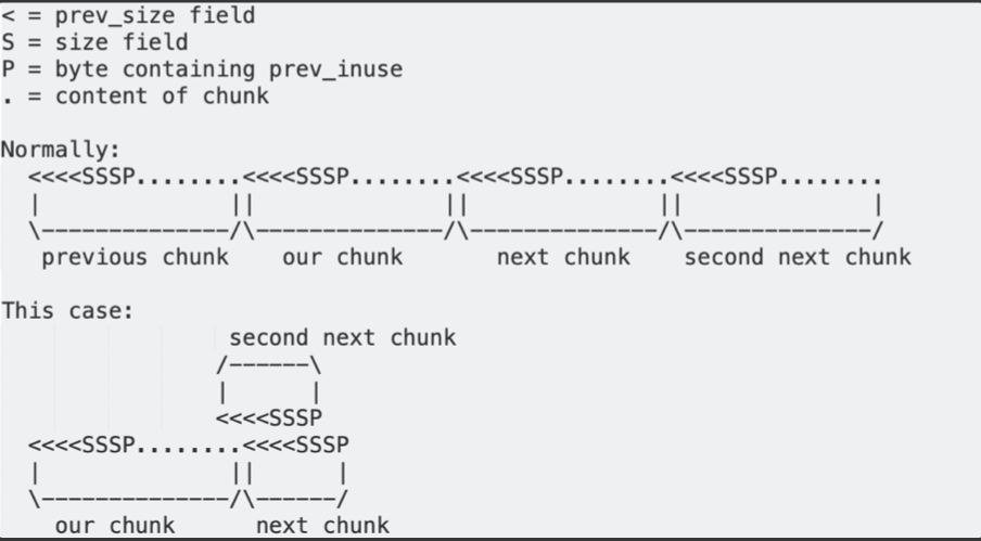 - The allocator must think that the previous and the next chunks are currently in use. Otherwise, it will try to unlink() them, which will either crash or abort, since the forward and backward pointers will not be correct.