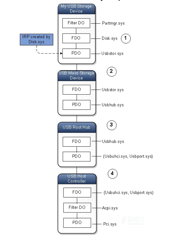 First, when we connect a USB device to a Windows PC, the PCI bus driver finds newly connected devices by checking PCI slots. At this time, the PCI bus driver finds the USB host controller and reports it to the Windows PnP manager to create a Physical Device Object (PDO).