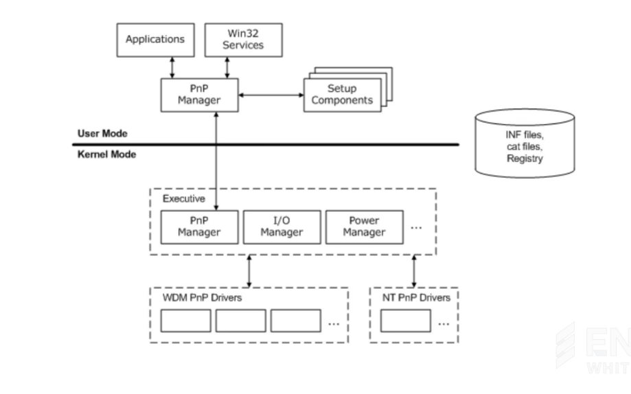 We briefly explain what Plug-and-Play (PnP) is before moving on from the Background part. PnP is a part of the Windows architecture that automatically detects changes in system hardware configuration. PnP is a useful technology that allows new devices to be used immediately without a system reboot by working with the user-mode/kernel PnP manager, I/O manager, bus drivers, function drivers, etc.