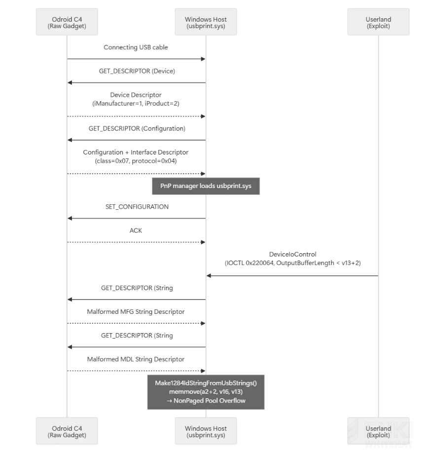 ENKI WhiteHat’s article analyzes CVE-2026-32223, a Windows kernel vulnerability in the USB printer driver usbprint.sys. The researchers explain how Windows interprets USB descriptors during enumeration and automatically loads drivers through Plug-and-Play. If a malicious USB device provides malformed configuration data, this trust boundary can become a kernel attack surface. The vulnerability is a heap-based buffer overflow caused by insufficient validation inside Make1284IdStringFromUsbStrings, reached through USBPRINT_ProcessIOCTL and IOCTL 0x220064. The bug occurs when the driver builds an IEEE 1284 printer ID string from attacker-controlled manufacturer and model USB string descriptors, then copies it into an output buffer without properly validating the destination size. The article walks through the USB stack, descriptor parsing, root cause analysis, heap manipulation, and exploitation path. The final result is local privilege escalation from a crafted USB printer-like device plus userland interaction to SYSTEM integrity.