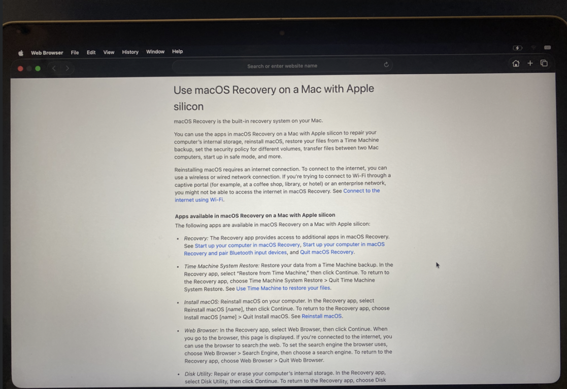 This got me very interested because why is there a Safari on Mac Recovery? so being the very curious person I am I decided to press on it which takes you to something that looks like this: