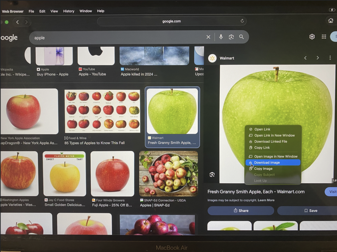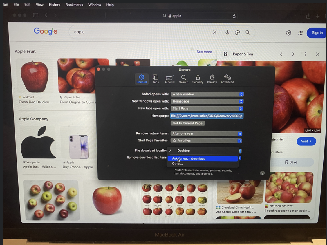 So setting Safari->File Download Location -> Ask For each download did the trick. Now when you would attempt to download the image of the apple you could save it where ever you liked.