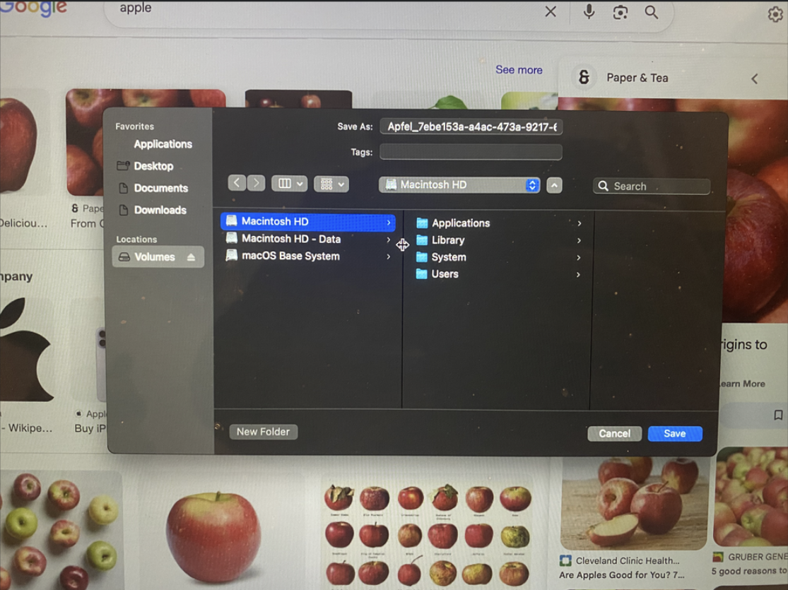 This is where it started to get really interesting, for some reason in Recovery Mode, macOS decides to boot the Volumes partition which includes Data, Macintosh HD, macOS Base System, and Prebootsystems, and when you choose the Macintosh HD it allows you to save the file to the Mac’s permanent disk.