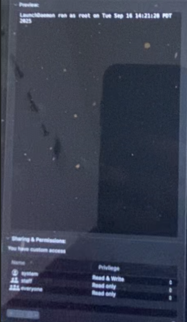 echo "LaunchDaemon ran as $(whoami) on $(date)" >> /var/root/proof_of_vulnerability.txt