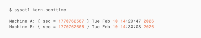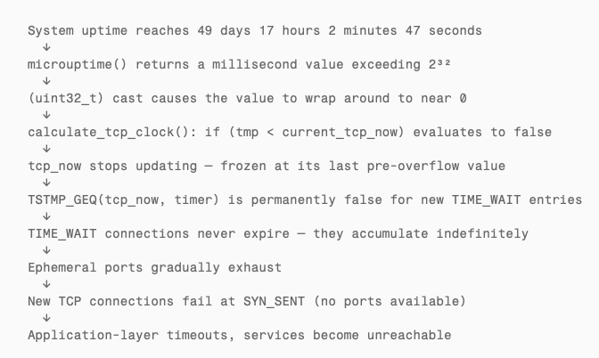 On March 30, 2026 — exactly 49.7 days after the last round of reboots — several machines in the fleet silently stopped establishing new TCP connections. Pings still worked. Existing connections stayed alive. But anything that needed a new TCP socket simply failed. The pattern was unmistakable: the XNU kernel’s TCP timestamp counter had wrapped, and a monotonicity guard prevented it from updating past the overflow. The internal TCP clock froze. TIME_WAIT connections stopped expiring. Ephemeral ports began piling up with no way to reclaim them. The only recovery was a reboot — which just restarted the 49.7-day countdown.
