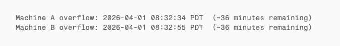 Machine A’s script stopped ~50 seconds after overflow. Machine B continued for 5 more minutes. Both machines’ monitoring ran until manually terminated.