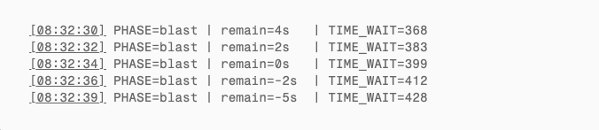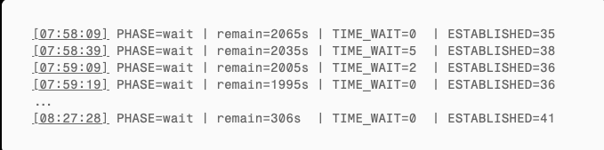 - Monitoring phase (overflow − 35 min to overflow − 5 min): Record TIME_WAIT count every 10 seconds. No active connection creation.