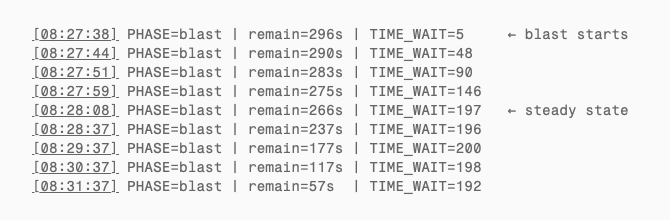 At 08:27:38, the script began creating connections. Within 30 seconds, TIME_WAIT climbed from 0 to ~200 and then plateaued: