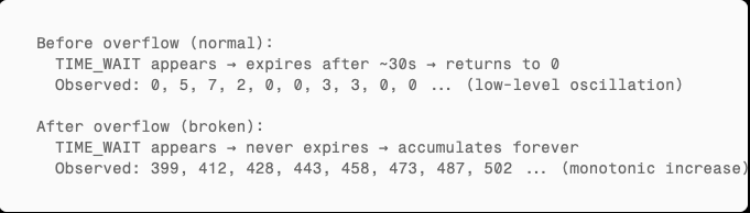 - Before overflow: TIME_WAIT connections expire normally after ~30 seconds