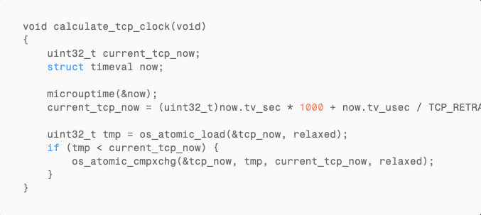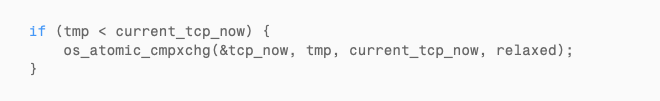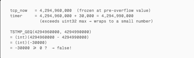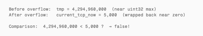 The intent is straightforward: “tcp_now must only move forward.” Under normal operation, this works perfectly. But at the moment of overflow: