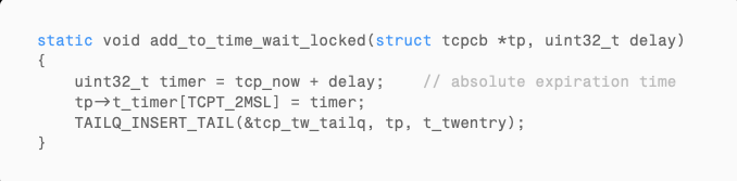 When a TCP connection enters TIME_WAIT, the kernel records an absolute expiration time. In bsd/netinet/tcp_timer.c, the function add_to_time_wait_locked() does this: