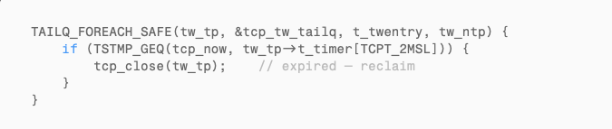 The kernel’s garbage collector tcp_gc() periodically scans the TIME_WAIT queue: