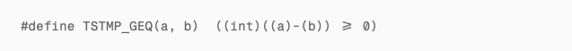 This is a standard signed modular arithmetic comparison, designed to handle sequence number wraparound. Normally (with tcp_now advancing), when tcp_now >= timer it returns true and the connection gets cleaned up.