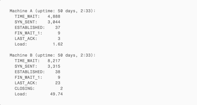 - Machine B’s load average spiked to 49.74 as the kernel burned CPU scanning the ever-growing TIME_WAIT queue