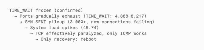 We reproduced this on multiple servers in our fleet. The evidence is conclusive: before the overflow, TIME_WAIT expires normally (0–13 entries); after the overflow, TIME_WAIT never reclaims (accumulating to thousands). tcp_now froze. The kernel’s TCP clock stopped. Everything else looked fine — until the ports ran out.