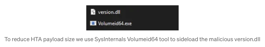 - “–post-cmd= ^%temp^%\Volumeid64” By default, EMBED_DROP will drop the embedded files in %TEMP%. So we instruct the payload to execute the dropped Volumeid64.exe (which will load the malicious version.dll)