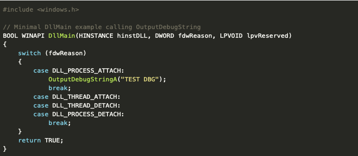The DllMain function is an optional entry point that Windows automatically calls when a process or thread is initialized or terminated, or when the DLL is loaded or unloaded (via LoadLibrary or FreeLibrary). In this task, we use DllMain to invoke OutputDebugStringA with the string "TEST DBG":