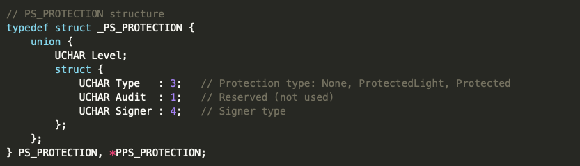 Several years later, starting with Windows 8.1 / Server 2012 R2, Microsoft introduced an extension to this concept known as Protected Process Light (PPL). PPL builds on the existing Protected Process model and introduces the concept of protection levels, meaning that some protected processes can be guarded more strictly than others. The protection level of a process is stored in the Protection field of the kernel structure EPROCESS, which is defined using the following structure: